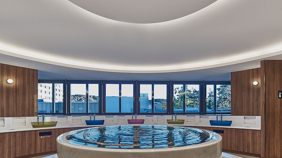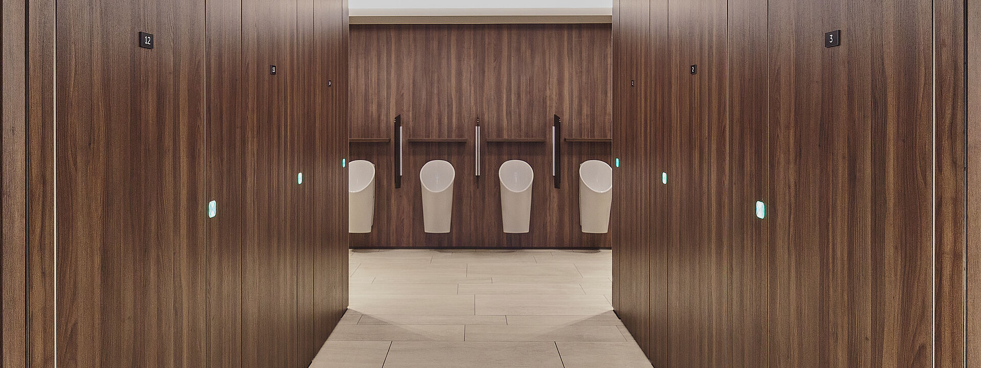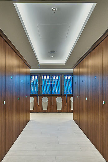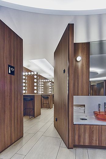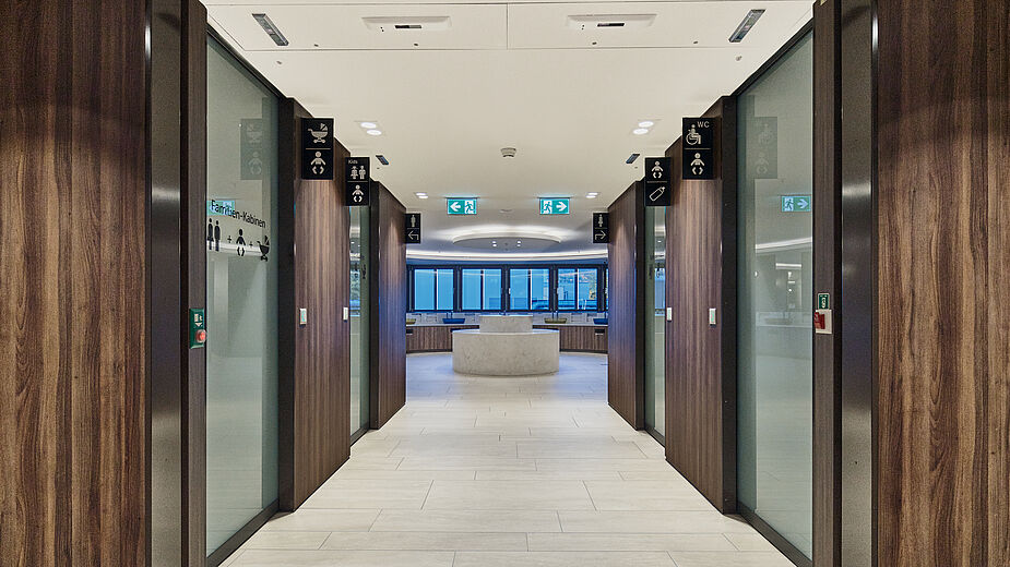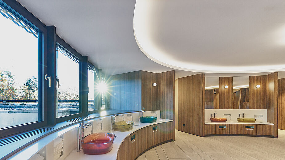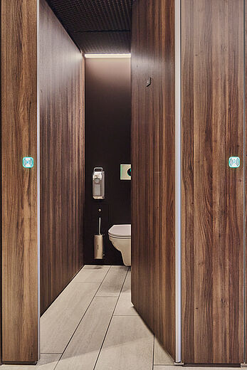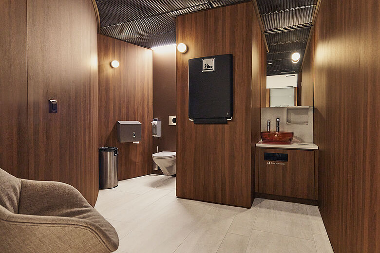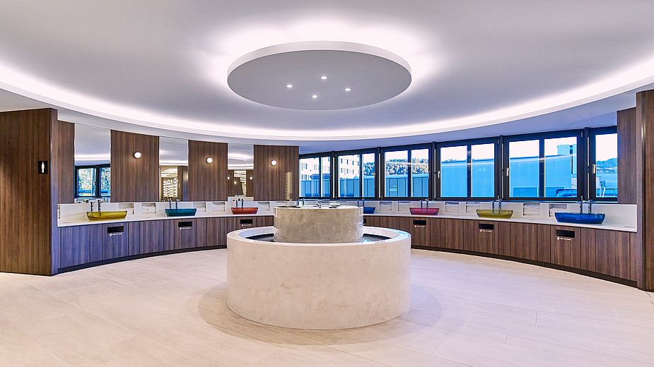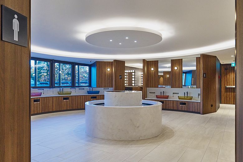 The new design emphasises the upscale ambition of the project with its generous room layout and formal language as well as high-quality materials and atmospheric lighting. At the same time, a high degree of functionality was ensured through partitioning systems and intelligent design: Baby-changing or family rooms, an area with make-up mirrors and a water feature in the centre of the circular washing area create an inviting atmosphere. At the same time, the equally robust and easy-care surfaces of the wood-based materials used ensure that the new sanitary facilities are easy to keep clean and remain permanently attractive.