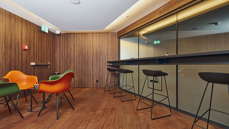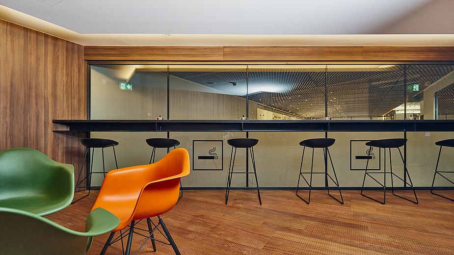 The smokers' lounge was designed with the same attention to detail: Wall coverings in a dark wood coordinate perfectly with the floor scheme and the colourful seating furniture invites visitors to linger. At the same time, visitors to the lounge can relax and observe as shoppers pass through the shopping corridors between stores: The smokers' lounge is located in the Tivoli Gallery and has a bay of windows facing the interior of the shopping centre.