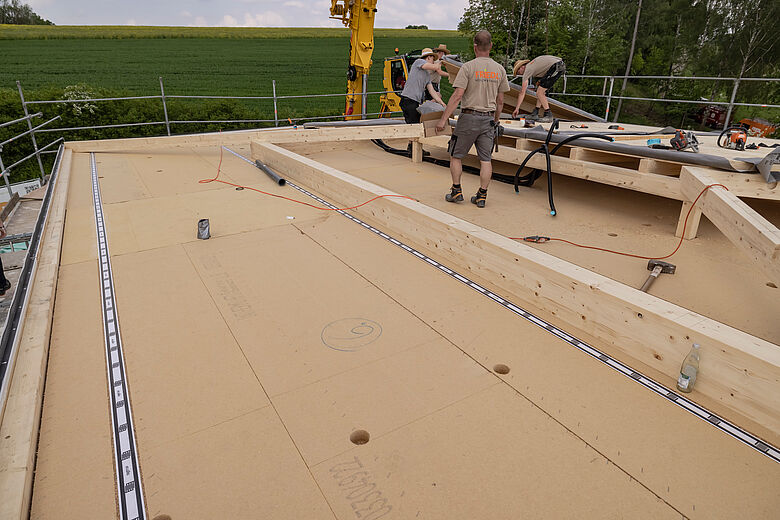 This is also evident elsewhere: the cooperation with Pfleiderer is based on precisely these shared values and visions. The fiberboard StyleBoard MDF.RWH was also a conscious choice for the new show house. As a diffusion-open sarking board, it is suitable for use in the roof and wall. The high dimensional accuracy of the tongue and groove ensures an optimum fit and level, resulting in a flush installation.