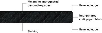 - Compact laminate black: Uniform black through-pigmented solid compact laminate core, impact resistant and moisture resistant for applications with high specification demands.