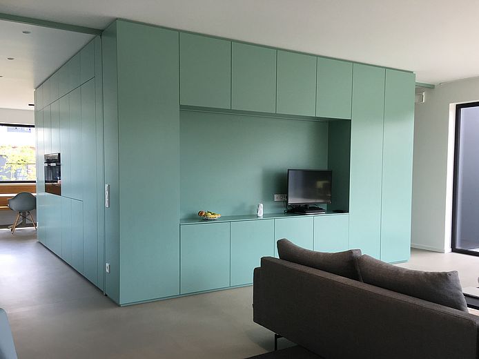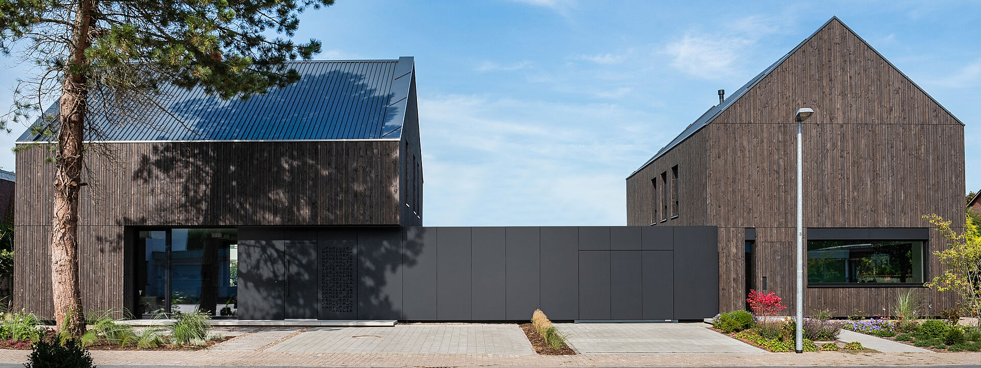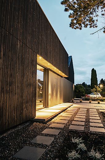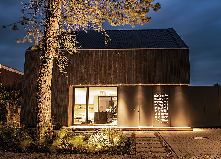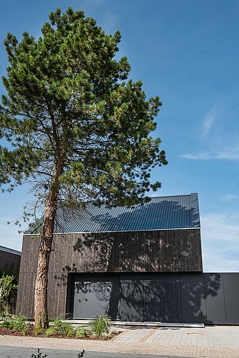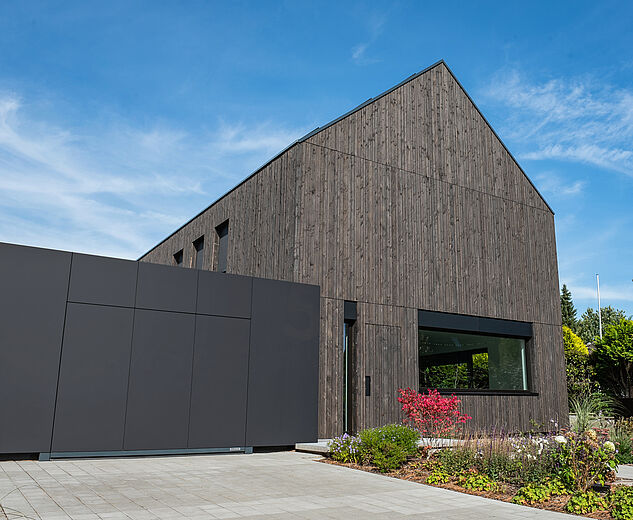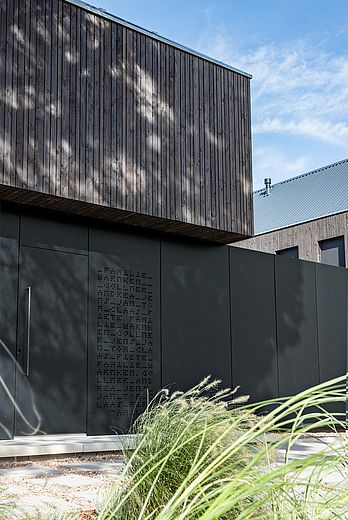 与我的理念一致,业主方极具设计意识且勇于尝试创新,"RUGE+GÖLLNER公司总经理说道。木质立面的设计初衷是重现费希塔(Vechta)地区传统农舍风格,而Pfleiderer哑光外墙材料打造的黑色巨型单体结构则成为颠覆性元素——宛若嵌入两栋建筑之间的独特纽带。"我们非常高兴能试用这款新型外墙材料,"Jens Göllner表示,"因室内领域我们长期信赖Pfleiderer产品,其抗刮擦与耐久性堪称业界标杆。如今我们得以实现室内外设计的完美统一。"这款火山黑(Vulkanschwarz)XTreme哑光饰面既应用于标志性单体外墙,也现身于他的私人厨房:"这种哑光表面尽显高端质感,始终是视觉焦点。