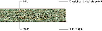 - ClassicBoard Hydrofuge MR: 符合 EN 312 标准并且厚度膨胀减少的尿素树脂复合型家具板材,适用于潮湿区域的非承重目的。