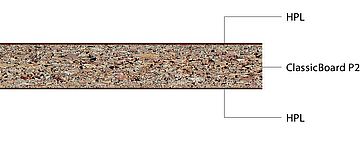 - ClassicBoard P2: Dřevotřísková deska typu P2 lepená močovinovou pryskyřicí podle EN 312, vhodná pro nenosné účely v suchém sektoru.