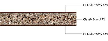 - Dekorativní povrch je tvořen lakovanou hliníkovou fólií. Jádro materiálu se skládá z papírových vrstviček prosycených duroplastovou pryskyřicí. Ta zcela vytvrdne během výrobního procesu žárem a vysokým tlakem a vytvoří stabilní, rezistentní a nereaktivní materiál.