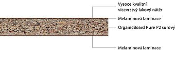 - OrganicBoard Pure P2 surový: Dřevotřískové desky lepené 100 % biogenním lepidlem bez formaldehydu (OrganicGlue) se 100 % podílem recyklovaného dřeva typu P2 podle EN 312, vhodné pro nenosné účely v suchých prostorách.