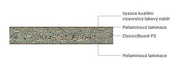 - ClassicBoard P3: Dřevotřísková deska typu P3 vhodná pro nenosná použití ve vlhkých prostorech.
