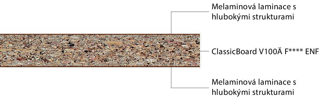 - ClassicBoard V100 Ä F**** ENF: Nábytková deska lepená močovinovou pryskyřicí s velmi nízkými hodnotami emisí a sníženým tloušťkovým bobtnáním dle EN 312, vhodná pro nenosná použití ve vlhkých prostorách.