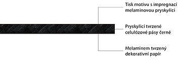 - Kompaktní laminát černý: Homogenní černě probarvené, masivní kompaktní vrstvené jádro, odolné proti nárazu a proti vlhkosti, pro použití na vysoce namáhané plochy.