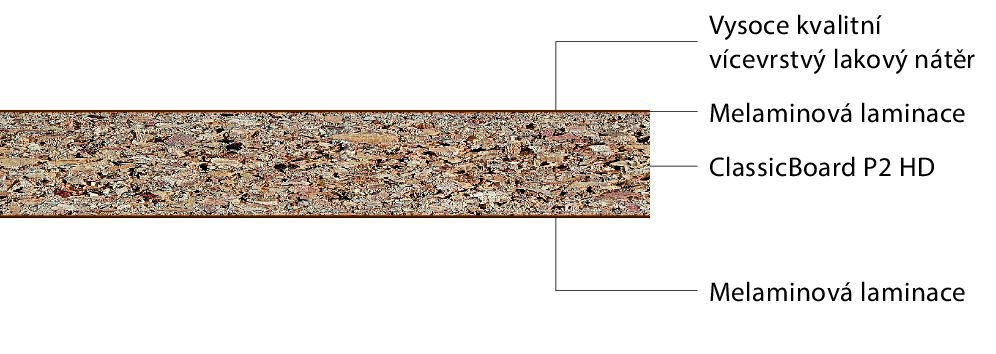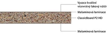 - ClassicBoard P2 HD TSCA: Dřevotřísková deska lepená močovino-formaldehydovou pryskyřicí, typ P2 podle normy EN 312, s vysokou hustotou a zlepšenými povrchovými vlastnostmi.