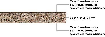 - ClassicBoard P2 F****: Dřevotřísková deska typu P2 s minimalizovanými hodnotami emisí, vhodná pro nenosné účely v suchém sektoru.