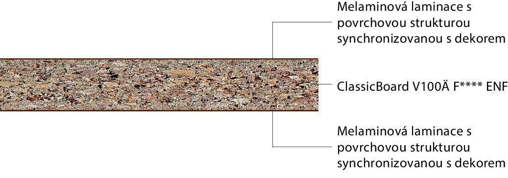 - ClassicBoard V100 Ä F**** ENF: Nábytková deska lepená močovinovou pryskyřicí s velmi nízkými hodnotami emisí a sníženým tloušťkovým bobtnáním dle EN 312, vhodná pro nenosná použití ve vlhkých prostorách.