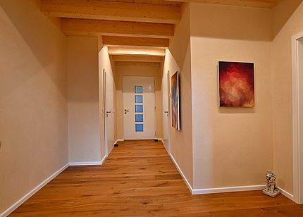 Hans-Jürgen Kremer: Ja, wir haben einen Wandaufbau bei den Innenwänden gewählt, bei dem der Lehm direkt auf die Holzwerkstoffoberfläche aufgetragen wird. Dabei haben wir mit PremiumBoard MFP Living P5 die besten Erfahrungen gemacht. Die BioSol Naturbau GmbH, die den Innenausbau ausgeführt hat, hat bislang auf andere Platten gesetzt, aber die Oberflächenbeschaffenheit der Pfleiderer Platte konnte auf der ganzen Linie überzeugen. Das heißt, sie wird wahrscheinlich in Zukunft öfter zum Einsatz kommen. Bei unserem Wandaufbau wird zunächst ein Schilfrohrgeflecht auf der Plattenoberfläche befestigt. Anschließend wird eine 15-mm-Schicht Lehm aufgetragen. Wenn sie getrocknet ist, erfolgt die Schlussbeschichtung mit einer 2 mm starken Edelputz-Schicht. Und auch hier bleiben wir dem Prinzip Ökologie treu, denn der Edelputz von Conluto besteht aus farbigem Lehm und Ton, zum Teil werden noch gemischt-körnige Sande und Zellulose eingemischt. Insgesamt entsteht eine hoch ästhetische, pflegeleichte und vor allem offenporige Wand, mit den bereits erwähnten positiven Eigenschaften in puncto Wohnklima.