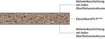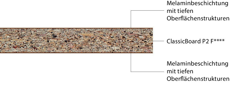 - ClassicBoard P2 F****: Emissionsminimierte Holzspanplatte Typ P2, geeignet für nicht tragende Zwecke im Trockenbereich.