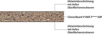 - ClassicBoard V100 Ä F**** ENF: Harnstoffharzgebundene Möbelplatte mit sehr niedrigem Emissionswert und reduzierter Dickenquellung gemäß EN 312, geeignet für nicht tragende Zwecke im Feuchtebereich.