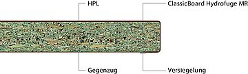 - Die dekorative Oberfläche und der Materialkern bestehen aus Papierlagen, die mit duroplastischen Harzen durchtränkt sind. Diese härten während des Herstellprozesses durch Hitze und hohen Druck vollständig aus. Sie bilden ein stabiles, resistentes und nicht reaktivierbares Material.
