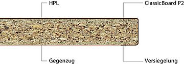 - Die dekorative Oberfläche und der Materialkern bestehen aus Papierlagen, die mit duroplastischen Harzen durchtränkt sind. Diese härten während des Herstellprozesses durch Hitze und hohen Druck vollständig aus. Sie bilden ein stabiles, resistentes und nicht reaktivierbares Material.