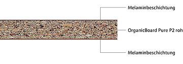 - OrganicBoard Pure P2 roh: Mit 100 % biogenem, formaldehydfreiem Leim (OrganicGlue) gebundene Holzspanplatte mit einem Recyclingholzanteil von 100 % Typ P2 gemäß EN 312, geeignet für nicht tragende Zwecke im Trockenbereich.