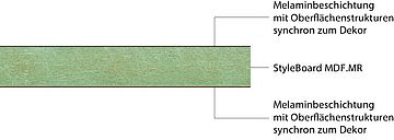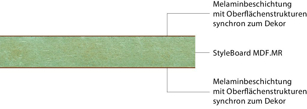 - StyleBoard MDF.MR: Mitteldichte Faserplatte (MDF), mit homogenem Aufbau.