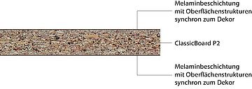 - ClassicBoard P2: Harnstoffharzgebundene Holzspanplatte Typ P2 gemäß EN 312, geeignet für nicht tragende Zwecke im Trockenbereich.