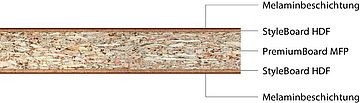 - PremiumBoard MFP Hybrid: Bei PremiumBoard MFP Hybrid handelt es sich um eine Kombination aus PremiumBoard MFP als Mittellage und HDF-Platte als Deckschicht mit einer Dicke von 2 mm, welche auch beidseitig beschichtbar ist. Die Verklebung zwischen MFP und HDF erfolgt mittels PVAC-Leim (D4-Leim). Diese Hybrid-Holzwerkstoffplatte eignet sich aufgrund ihrer isotropen Biegefestigkeit, ihrer sehr hohen Schraubenauszugsfestigkeit und ihres guten Stehvermögens vor allem für Anwendungen, bei denen es auf Stabilität und Belastbarkeit ankommt.