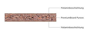 - PremiumBoard Pyroex: Schwer entflammbare Holzspanplatte, geeignet für nicht tragende Zwecke im Trockenbereich, die erhöhten Anforderungen an das Brandverhalten unterliegt.