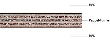 - Die dekorative Oberfläche und der Materialkern bestehen aus Papierlagen, die mit duroplastischen Harzen durchtränkt sind. Diese härten während des Herstellprozesses durch Hitze und hohen Druck vollständig aus. Sie bilden ein stabiles, resistentes und nicht reaktivierbares Material.