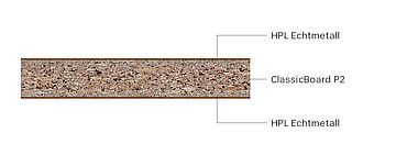 - Die dekorative Oberfläche ist eine lackierte Aluminiumfolie. Der Materialkern besteht aus Papierlagen, die mit einem duroplastischen Harz durchtränkt sind. Dieser härtet während des Herstellprozesses durch Hitze und hohen Druck vollständig aus und bildet ein stabiles, resistentes und nicht reaktivierbares Material.