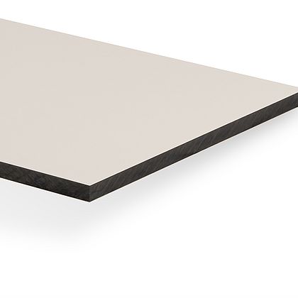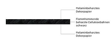 - Flammhemmender Kompaktschichtstoff schwarz: Homogen schwarz durchgefärbter, massiver Kompaktschichtstoffkern, geeignet für hochbeanspruchte Anwendungen, die Anforderungen an das Brandverhalten unterliegen.