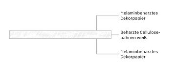 - Die dekorative Oberfläche und der Materialkern bestehen aus Papierlagen, die mit duroplastischen Harzen durchtränkt sind. Diese härten während des Herstellprozesses durch Hitze und hohen Druck vollständig aus. Sie bilden ein stabiles, resistentes und nicht reaktivierbares Material.