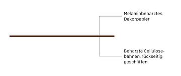 - Die dekorative Oberfläche und der Materialkern bestehen aus Papierlagen, die mit duroplastischen Harzen durchtränkt sind. Diese härten während des Herstellprozesses durch Hitze und hohen Druck vollständig aus. Sie bilden ein stabiles, resistentes und nicht reaktivierbares Material.