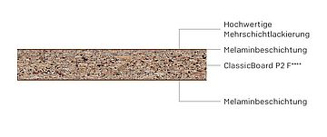 - ClassicBoard P2 F****: Emissionsminimierte Holzspanplatte Typ P2, geeignet für nicht tragende Zwecke im Trockenbereich.
