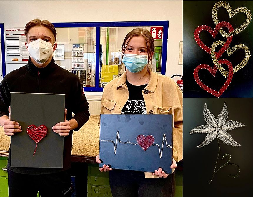 Bereits seit mehreren Jahren überlegen sich die Ausbilder eine Kleinigkeit, die leicht und zügig herstellbar und zugleich schön anzuschauen ist. Dieses Jahr wurden eine Art Nagelbretter hergestellt. Hierfür wurden in zugeschnittene, hauseigene HPL-Platten Löcher für das ausgesuchte Motiv gebohrt. Danach konnten um die hineingesteckten Nieten verschiedenfarbige Bindfäden gewickelt werden. Egal, ob kaufmännischer oder technischer Azubi, jeder hatte die Möglichkeit, gestalterisch aktiv zu werden. Mit viel Geduld und Kreativität fertigten die Azubis hierbei die unterschiedlichsten Motive an und jedem ist es gelungen, ein schönes, persönliches Geschenk herzustellen.