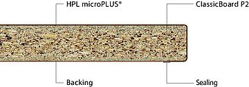 - The decorative surface and the core consists of paper layers, which are impregnated with thermosetting resins. The resins harden completely during the manufacturing process by heat and high-pressure. They form a stable, resistant and non-reactive material.