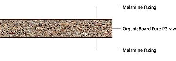 - OrganicBoard Pure P2 raw: Chipboard bonded with 100 % biogenic, formaldehyde-free glue (OrganicGlue) with a recycled wood content of 100 % type P2 conforming to EN 312, suitable for non-load-bearing purposes in dry areas.