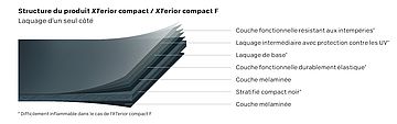 - Duropal XTerior compact F répond aux exigences les plus élevées en matière de résistance aux UV de la surface et convient parfaitement à une utilisation en extérieur, par exemple comme façades, meubles de jardin, écrans d'intimité, dessous de toiture, balcons ou aires de jeux, grâce à sa protection préventive contre les incendies, ses valeurs élevées de résistance mécanique et sa liberté de conception. Surtout lorsque les exigences en matière de robustesse, de résistance aux intempéries et de facilité de nettoyage sont élevées.