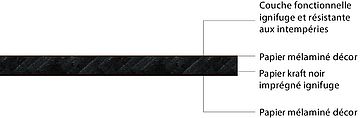 - Stratifié compact noir difficilement inflammable : Âme en stratifié compact, massive, homogène et teintée en noir, convient aux applications à forte charge soumises aux exigences de comportement au feu.