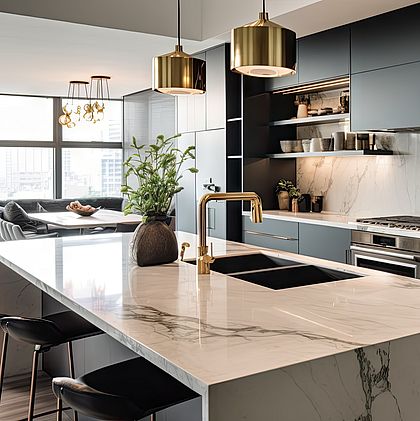 • Plans de travail en grès, travertin, ardoise ou marbre dans une palette de couleurs douces.