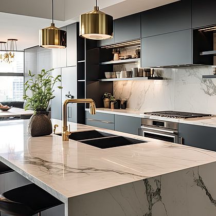 • Plans de travail en grès, terrazzo ou marbre. Accessoires : métaux mats chauds, osier et rotin.