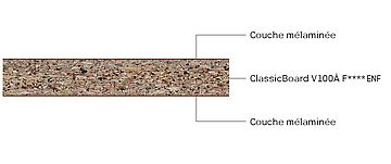 - ClassicBoard V100 Ä F**** ENF : Panneau de mobilier lié par résine d'urée et présentant de très faibles émissions et un gonflement en épaisseur réduit selon la norme EN 312, adapté aux applications non porteuses dans des conditions humides.