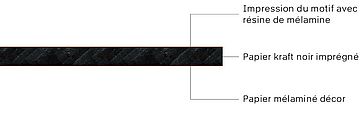 - Stratifié compact noir : Âme en stratifié compact, massive, homogène et teintée en noir, antichoc et résistant à l’humidité pour les applications à fortes charges.