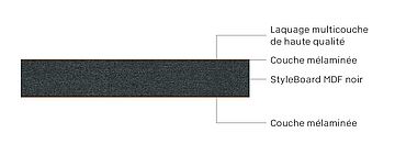 - StyleBoard MDF noir : Panneau de fibres de densité moyenne (MDF) teinté dans la masse en noir de manière décorative, avec une structure homogène.
