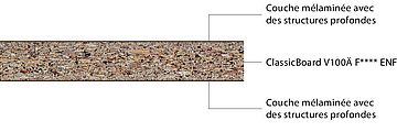 - ClassicBoard V100 Ä F**** ENF : Panneau de mobilier lié par résine d'urée et présentant de très faibles émissions et un gonflement en épaisseur réduit selon la norme EN 312, adapté aux applications non porteuses dans des conditions humides.