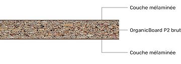 - OrganicBoard P2 brut : Panneau de particules de bois avec un encollage 50 % biosourcé et sans formaldéhyde (OrganicGlue), fabriqué à partir de 50 % de bois recyclés post-consommation. Panneaux P2 selon la norme EN 312, adaptés aux utilisations non porteuses en milieu sec.