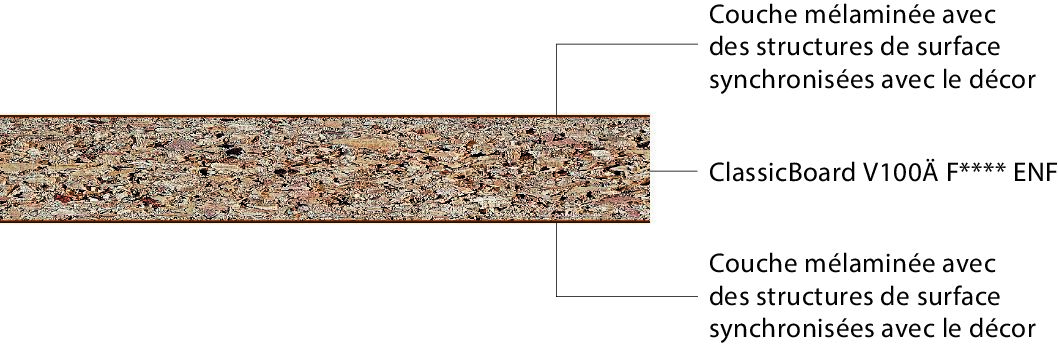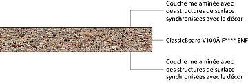 - ClassicBoard V100 Ä F**** ENF : Panneau de mobilier lié par résine d'urée et présentant de très faibles émissions et un gonflement en épaisseur réduit selon la norme EN 312, adapté aux applications non porteuses dans des conditions humides.