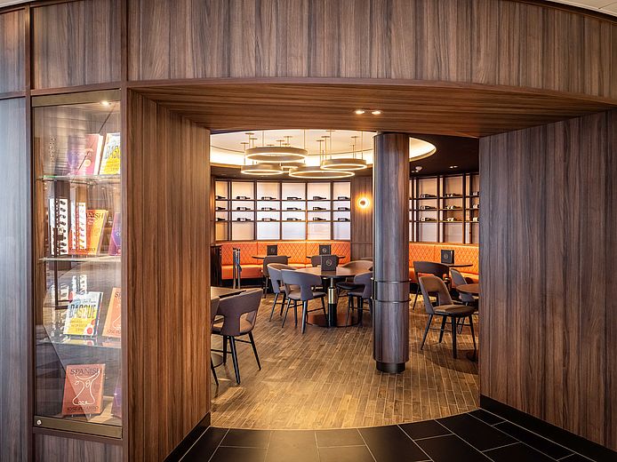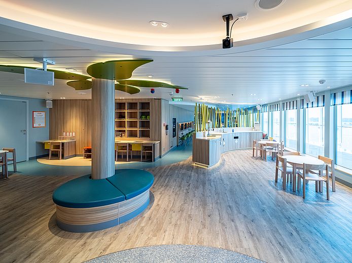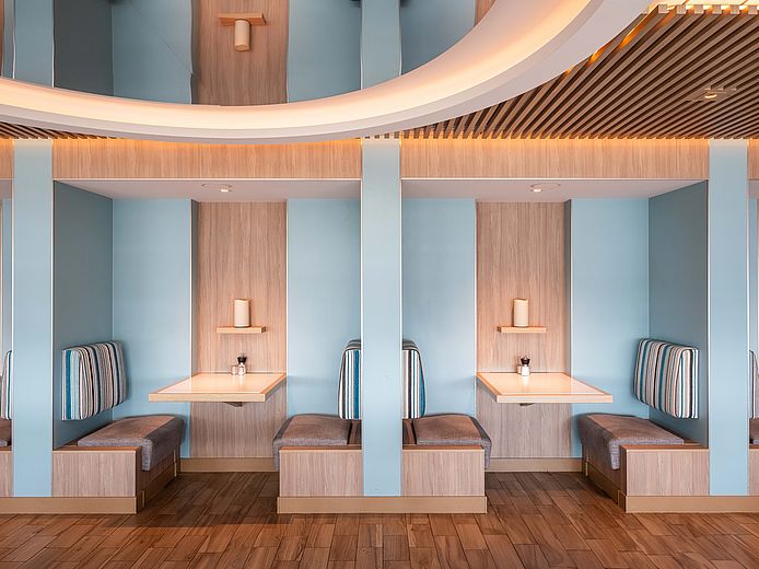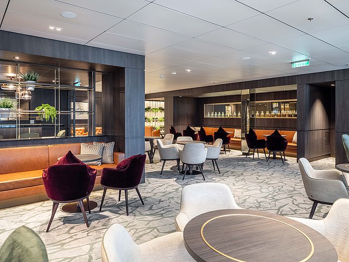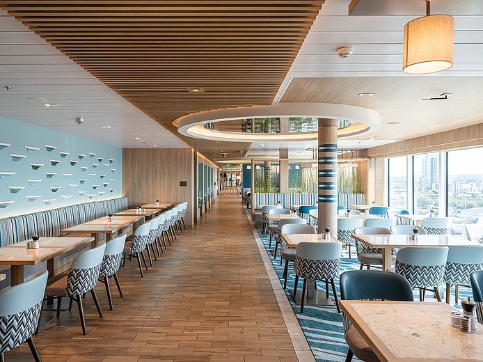 L'aménagement intérieur du navire de croisière se caractérise par un design lumineux et spacieux qui combine des éléments modernes avec des influences maritimes. Les tons chauds s'harmonisent avec les nuances fraîches de bleu et créent une atmosphère détendue et élégante. Les passagers peuvent s'attendre à un hébergement confortable, parfait pour passer des journées reposantes à bord.