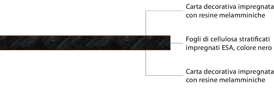 - La superficie decorativa e l'anima si compongono di piú strati di carta impregnate di resine termoindurenti; queste resine si fondono completamente durante il processo di fabbricazione che sotto l'effetto del calore e dell'elevata pressione si da origine ad un materiale stabile, resistente e irreversibile.