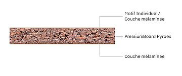 - PremiumBoard Pyroex : Panneau de particules de bois difficilement inflammable, convient aux applications non porteuses dans des conditions sèches soumises à des exigences de comportement au feu accrues.