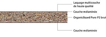 - OrganicBoard Pure P2 brut : Panneau de particules de bois lié avec une colle 100 % biogène et sans formaldéhyde (OrganicGlue), contenant 100 % de bois recyclé de type P2 selon la norme EN 312, adapté aux usages non porteurs en milieu sec.