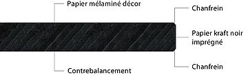 - Stratifié compact noir : Âme en stratifié compact, massive, homogène et teintée en noir, antichoc et résistant à l’humidité pour les applications à fortes charges.
