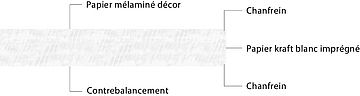 - La surface décorative et l’âme du matériau constituée de couches de papier imprégnées de résines thermodurcissables. Les résines durcissent complètement pendant le processus de fabrication, sous l'effet de la chaleur et de la pression élevée. Elles forment un matériau stable, résistant et non réactivable.